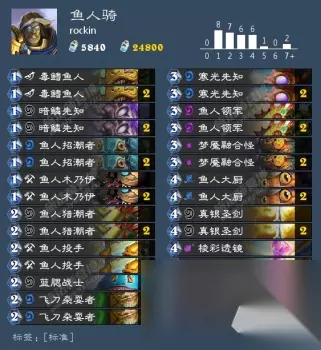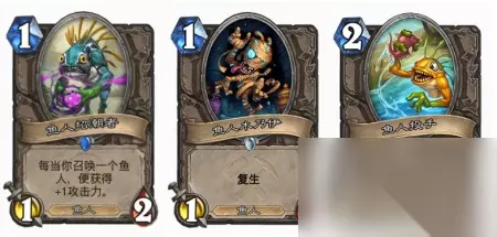 对阵思路: 起手找招潮者,这是所有鱼人套路的天胡不解释(而棱彩透镜则是更重要的存在!)其次就是鱼人木乃伊了,毕竟2个1/1,再而就是新卡鱼人投手了,对于我们是补充鱼人资源,对于对手嘛,就没什么用了,(除非对手有山岭,那么我们确实帮他减费了。)而开局成功站场的情况下,我们3费就至关重要了,不同的对手我们有不同的需求,不过一般下先知加血是不会错的,领军抢血也是不错的选择,趁着有场面先给对手一波血量压力嘛!(但是对手可能有aoe的情况就不适用了)而4费,如果有透镜就果断开,不要管对手什么场面,解场没出路的,找到鱼人为王,下回合一波7只,返场的概率反而更高。当然了,没棱镜那就下怪或者掏出大宝剑解场了,没其他选择。