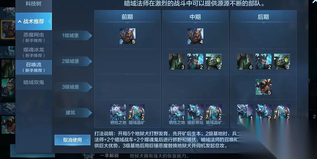 实战操作中,多编队与阵型控制尤为重要,建议关闭自动回撤功能,避免召唤物因残血回撤沦为敌方经验。开团时让梅林独自前压释放技能吸引仇恨,召唤物铺场后开启领主技能战意高昂防冲阵,伊娃在后排释放神圣道标与庇护领地,形成前后呼应的阵地。领主技能首选战意高昂与驻塔,驻塔技能可依托视野灵活造塔,用于开矿、拆矿或截断兵线,大幅提升战术灵活性;备选暴风雪用于分割阵型或追杀残敌。侦察需贯穿全局,通过步兵或飞艇监控敌方英雄装备与兵种转型,对抗不同种族调整集火优先级,面对帝国优先处理治疗单位,对抗暗域需保留修女驱散技能应对其召唤物,对抗蛮族则防范中期突袭。后期决战可利用双召唤物配合部队换家强拆,控制伊娃优先攻击矿工触发召唤物,快速摧毁敌方经济体系,同时注意传送技能的使用,仅能定位主基地或分矿,可用于紧急支援或撤退保全战力。召唤流的核心并非依赖召唤物数量,而是通过英雄、兵种、技能的联动构建持续压制力,稳扎稳打积累优势,最终实现战场制霸。