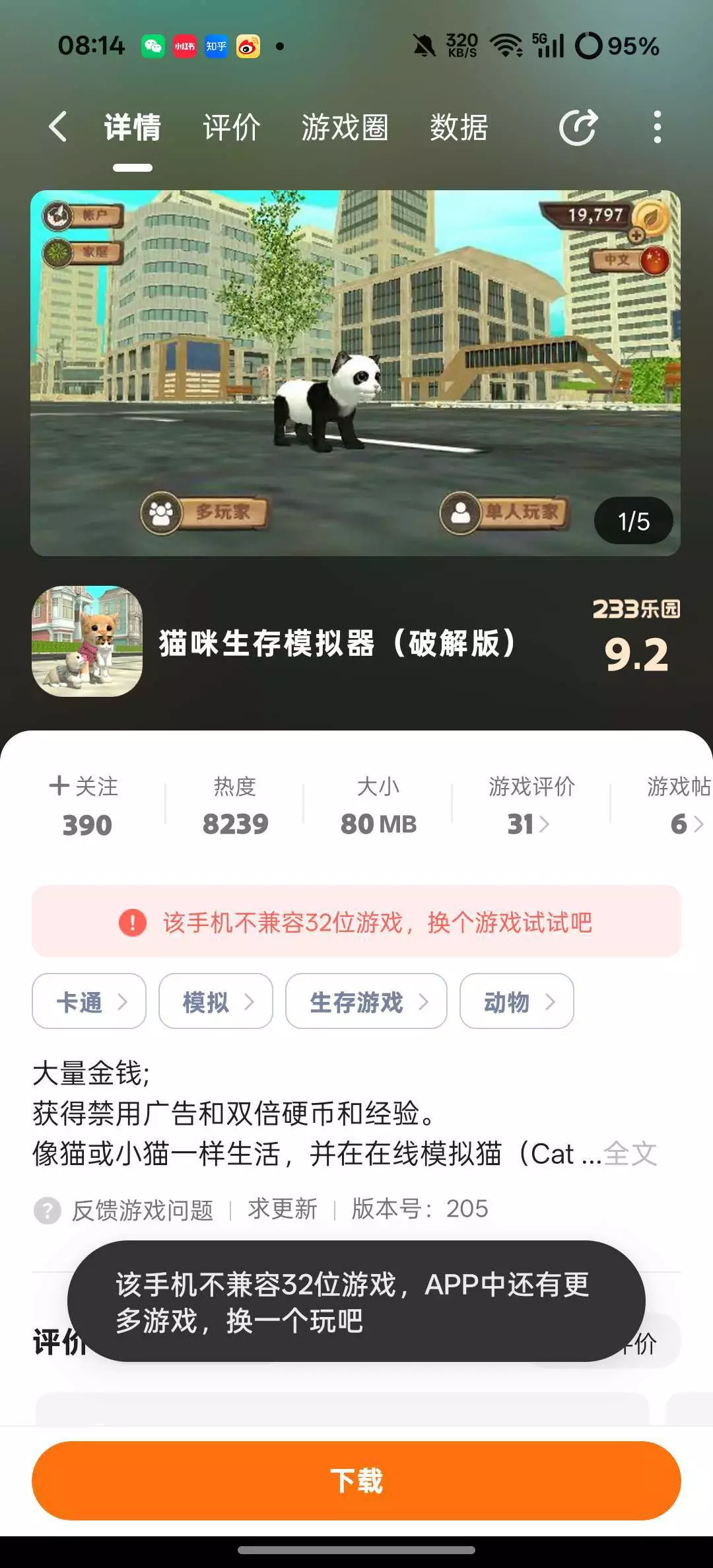 猫咪生存模拟器真的是一个很早起的游戏昨天我的233说我的版本过低已停服我才发现我这个有记录以来就在23年但实际20年就玩了现在却卡的要死他们说会卡退我换了手机也不兼容了😭也不知道官方还在不在可不可以更新感觉放下了童年……