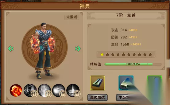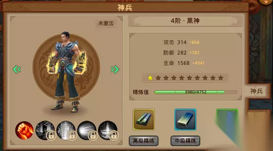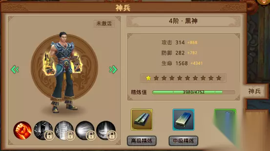 首先可以看到神兵这个界面,神兵共分为10阶,每阶有10级,其中提升等级可以增加三种属性:攻击,防御和生命,当升到10级后再升级即可提升阶级,获得新的形象 给大家展示几款炫酷的神兵