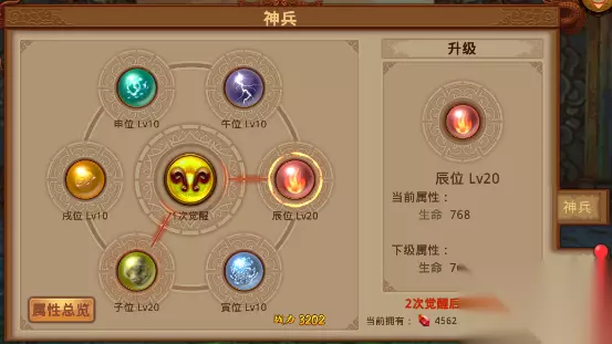 可以看到一件神兵根据传统的地支系统有六个位置可以加强:子 寅 辰 午 申 戌六个部位,每个部位对应增强不同的属性,当这六个部位都强化到一定等级时,即可使神兵觉醒,获得更大的强化
