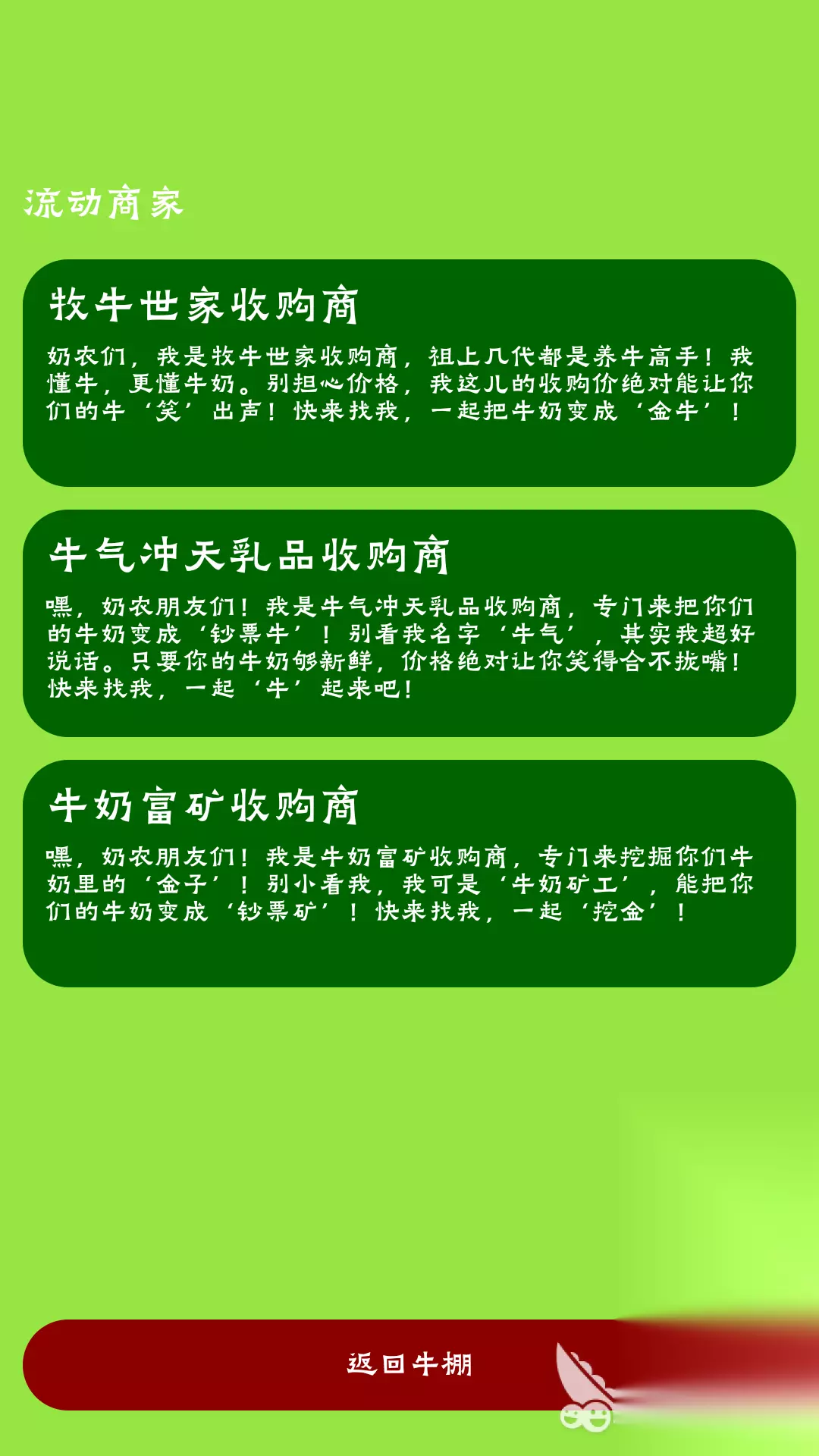 这款休闲有趣的小游戏的主要玩法是模拟经营牧场,游戏操作非常简单,它可以在休闲时间畅玩。游戏初始玩家将会获得一个牛棚,随着玩家通过经营牧场,玩家在管理牧场的过程中,包括一些喂养以及收集产物等等活动,之后玩家需要将产品卖出去,以换得游戏金币,然后再用这些金币来扩建牧场规模,增加牧场中动物的品种以及数量,逐渐成为牧场大亨。 高速下载 普通下载 优先233乐园APP下载 以上就是牧场游戏有哪些2025的相关内容介绍,相信在小编的介绍下玩家已经知道牧场游戏有哪些了。这块牧场游戏玩法都以模拟牧场为主,文章通过经营自己的小牧场以不断发展壮大,在游戏的过程中成就感十足哟,喜欢牧场游戏的玩家一定要试试小编推荐的这几款游戏。