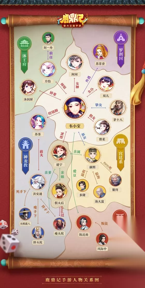 今天,让我一起穿越时间,回到八年前看看。据说,玩《鹿鼎记》端游玩家都会经历下面这四件事,来测试一下,你做过几件呢? 韦小宝教你厚黑学 《鹿鼎记》手游五大势力揭秘 《鹿鼎记》手游现已开启了预约,韦小宝和七个老婆的形象引发了众多玩家的喜(ji)爱(du)。但“社会你小宝哥”最厉害的,并不是他的女人缘,而是他能够从容游走于5大势力之中,天天河边走,一点没湿鞋! 今日,《鹿鼎记》手游曝光了一张人物关系图,将几大主角和各大NPC都放在了五大势力板块当中,力求还原金庸原著。