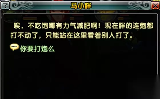 【奇闻合集】 ~~~~~~~~~~~~~~~~~~~~~~~~~~~~~~~~~~~~~~~~~~~~~~~ 《鹿鼎记》里的这些梗 只有老司机才能明白 在隐龙江做任务的时候,有一个NPC叫马小胖。可能大部分人都不记得了,不过这个马小胖的台词可谓是令人印象深刻。 任务的背景是找到一个NPC接任务,那个NPC会请玩家去帮助马小胖。等玩家找到马小胖,马小胖会说:“唉…我太胖啦,连炮都打不动了,你能帮我么?”然后玩家就要点击:“我来帮你打炮……”
