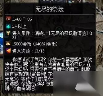 dnf无尽的祭坛用处 1、通关无尽的祭坛后,会显示你当前参加抽奖活动的次数,系统每周二和周五晚上8点会公布中奖名单。最高可以获得一亿金币的大奖。如果获得大奖的话,系统会通过邮件进行放送。通关无尽的祭坛后,有几率会爆出阿加雷斯的灵魂罐,抽装备。 2、刷经验用。每进一次需要花钱第一次1.5万、并且累加、最多13次大概100万左右。经验十分可观、而且更新祭坛时还有主线任务SP奖励。建议四人组队。