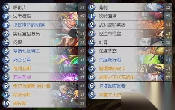 其实这套牌对于天梯上面最多的复活牧还是非常不错的,当然也是不会害怕任务骑或者宇宙猎。所以亡语贼在天梯还是有一席之地的。 整套卡组的思路就是节奏第一,贼不管什么卡组都是i在追求节奏的,当然我们也是可以去放弃一些牌的厚度去追求卡组的节奏。 当然比如暗影步不一定需要非要给恩作死,为了游戏的全齐更快的对战家走争取场面当然也是非常有必要的。