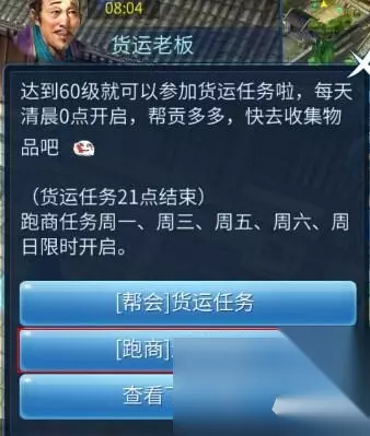 倩女幽魂手游跑商任务怎么玩?跑商任务流程是怎样?下面小编就给大家介绍一下倩女幽魂手游跑商任务。 任务简述:货运任务的后续任务,玩家把货物运到各地商贩处。可获得大量帮贡和银票、并获得帮会资金,每日可获得一次个人奖励。 任务等级:69 任务形式:单人 开启时间:每周一、周三、周五、周六、周日19:10-22:10。 任务开启时,帮会频道会刷出提示: 领取NPC:帮会城市-货商老板