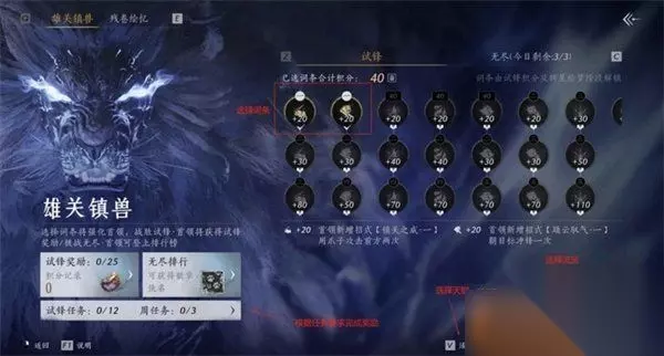 三、雄关镇兽 模式包含:试锋、无尽挑战 可单人或组队。 试锋模式: 无时间限制 持续战斗积累积分 无尽挑战: 每日3次限时挑战(3分钟) Boss打不死也可按输出量计分 词条搭配影响结算积分 击败Boss可获得「证果」道具,用于解锁活动专属天赋。 四、山河映辉 需先完成【残卷绘忆】与【雄关镇兽】部分,获得点亮所需道具。