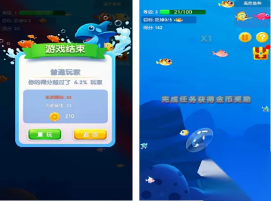 这是属于大家非常喜欢,通过控制大型的鱼儿吃比自己小的鱼儿以后,来完成进化的,同时也是有大家比较熟悉的游戏,所推出的正版续作。有精美的画质以及简单的操作方法,通过不断的完成吞噬小鱼进化以后,自己可以成为食物链当中顶点。每次吃掉了鱼儿以后,也能获得相应的奖励,帮助玩家进化的过程更顺利,也能选择不同的鱼儿。 高速下载 普通下载 2、《鱼吃鱼》