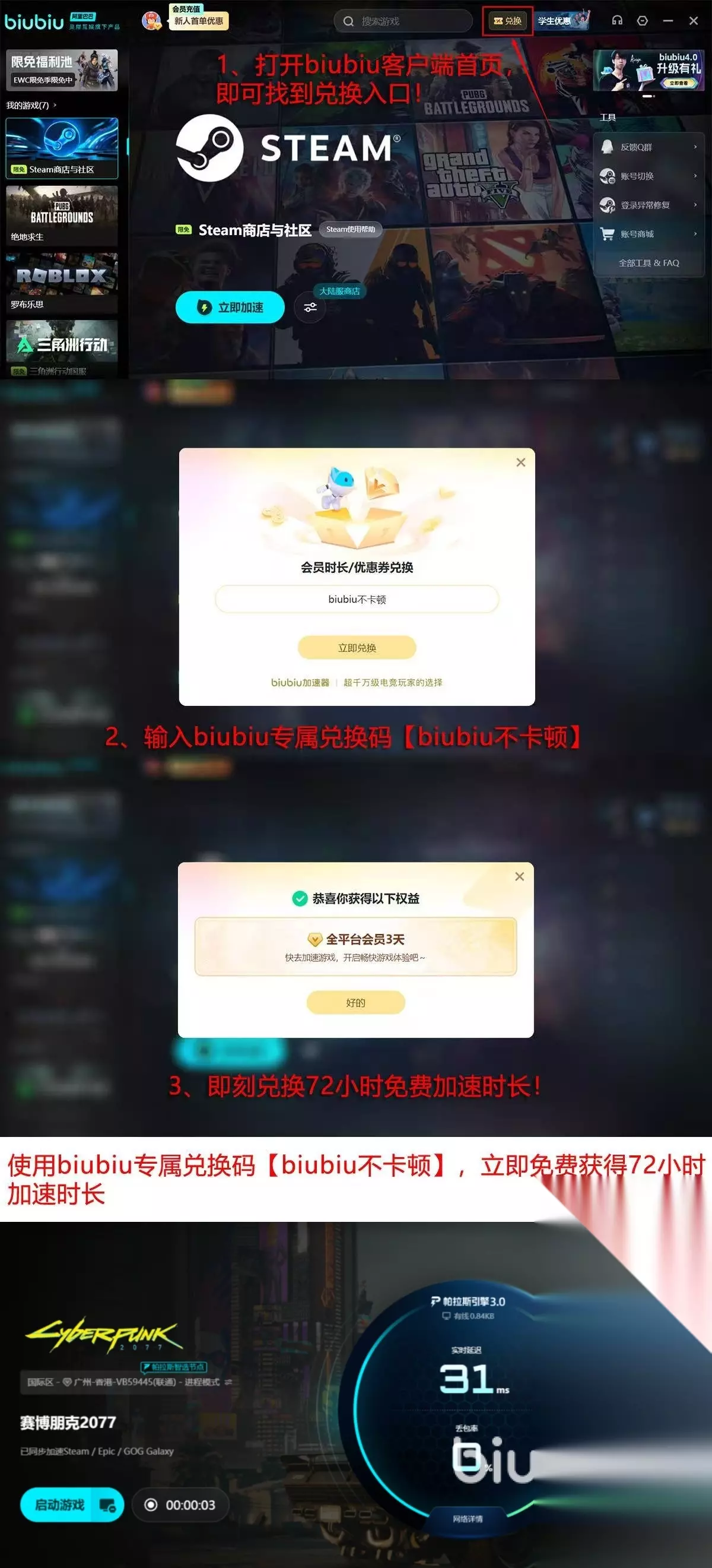在使用成本方面,大家也不用过于担心,目前有着双重的福利机制,首先就是如果大家是新用户,进入其中进行注册就可以直接免费获取到1天的加速时长,另外使用【biubiu不卡顿】这个兑换码,不管是新老用户都能领取到3天的加速权限,这两者一起叠加,相当于新用户最高能获得96个小时,让玩家们能轻松无忧地享受到乐趣。