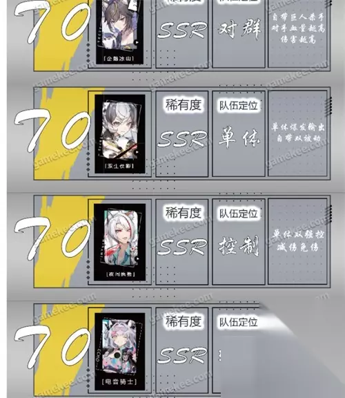 企鹅冰山、双生侠影、夜问执勤、电音骑士、恬静时刻 T0.5:强度很高,搭配其他角色有奇效,可以培养。 妙认灵笼、灭胜憧憬、电音风暴、鳐鳐心情、浮世摇 T1-T1.5:有不俗的强度,个别角色的能力比较突出,可以选择性培养。 绯红武士、防爆者、云顶饮料、细雨萌萌、妄想注射、海滩奇遇、幽篁月韵、叛逆主张、空战王牌、暴走炮手 T2:没有某定位的角色上位可以选择培养。 纯真拜访者、自由轮滑、灵棰惊竹、晚安故事、疯人院、闪亮捕获者、波子汽水 未入榜的角色过于平庸没有发现闪光点,就不上榜丢人了。 总之以上有些角色为上线正式服,以后会做出改动,现在公测版本已经上线幻神甜食守卫,场外焦点。其中甜食守卫,获取难度在开服较高,为此希望小伙伴们可以抽同期up的场外焦点。辅助永远的神。