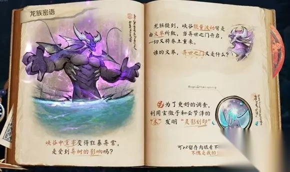 1、游戏中灵影刻印就是峡谷探秘活动中龙族密语环节中提到的一件鬼谷子利用玄微子和云梦泽的术制作的发明。 2、游戏中灵影刻印还是非常容易完成的,只需要玩家进入探索峡谷,然后前往主宰坑和主宰进行对话即可完成。 3、目前看来,灵影刻印应该可以用于调查一些肉眼看不到的线索,来帮助玩家和鬼谷子调查峡谷异变的真相。
