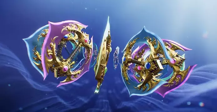 环刃-炫光掠影觉醒典雅高贵,通体由纯金打造,再以宝石镶嵌,使其更加华美。刀刃上的光效斑斓绚丽,多种色彩不停流转,将晚霞与极光一同揉进了刀刃上。