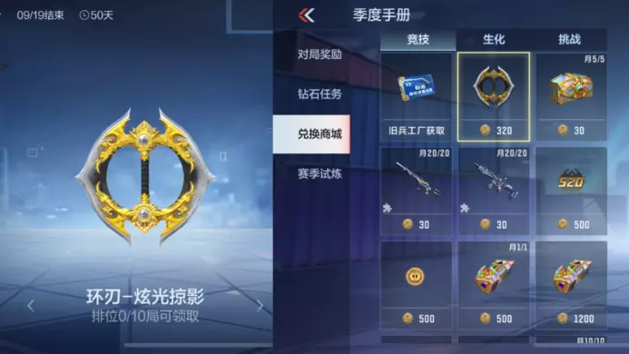 本赛季进行10把排位赛即可直接免费获得环刃-炫光掠影,当然,你也可以选择在季度手册中使用320排位币兑换,随后使用2025赛季武器通用觉醒石即可将其觉醒。