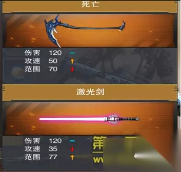 从以上对比可以看出,死亡除了伤害与烈焰屠龙刀持平以外,不管是在挥砍速度还是攻击范围上,全在后者之上,攻速方面,死亡多了5个参数,范围上也多了5个参数,名副其实的吊打!此次比拼,死亡完胜! 3.与激光剑进行对比