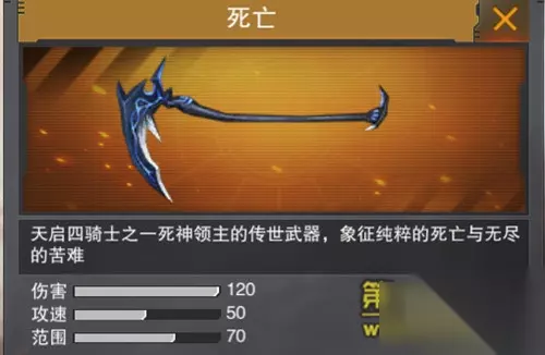 t15_2-t15_1:7.0 《枪战英雄》开学季全新版本已于9月7日正式与广大玩家见面,今天给大家带来的是近期刚刚推出不久的新近战武器-死亡的详细评测,我给他取了个霸气点的名字:死亡之镰! 看看,这多么风姿绰约!多么骚气十足!想必不少玩家晚上做梦都想要一把死亡玩玩吧?可惜的是挑战模式真是要憋死人… 不过接下来我会将死亡各类的完整数据全面体现在大家面前,没有的小伙伴也可以涨涨见识、再饱饱眼福了! 【武器介绍】:天启四骑士之一死神领主的传世武器,象征纯粹的死亡与无尽的苦难。 【获取途径】:通过挑战模式翻牌集齐死亡碎片合成所得,也会有成品翻牌,但几率较小。 一、外观评测 【第一人称手持图】