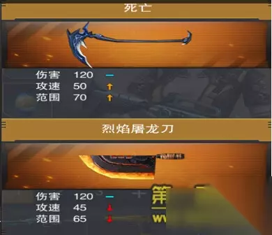 从以上对比看出,我们的老牌近战神器猴三棒依旧领先不少,不光在伤害上比死亡多了5参数,范围上也多了5参数,这样可不可以说是吊打死亡呢?当然不行。我们可以看到死亡的挥砍速度比猴三棒整整多了10参数!这应该叫长江后浪推前浪吧,虽然前浪还没死在沙滩上。 2. 与烈焰屠龙刀进行对比