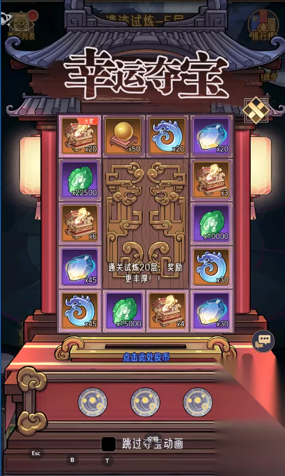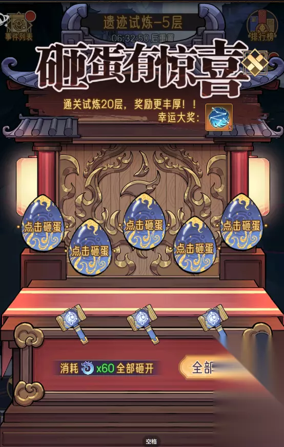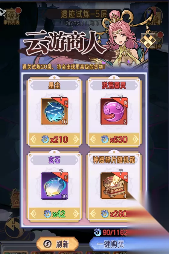 2.遗迹试炼 遗迹试炼仙友可以选择六个神将前往探索,在探索中每一次挑战只能一名神将前往,每层有四个小怪和一个boss,先要将小怪打完才能打boss,进入试炼时会有三个封印卷轴和三个金疮药,封印卷轴可以封印除boss以外的任意一个小怪,金疮药可以恢复选定的一名存活的神将一半的血量,每通关一层可以获得玄石和银两以及随机的奇遇;奇遇有砸金蛋,抽奖,商店等。 所以小貔貅建议有时间的玩家在做完每日必做的事情后可以来试试遗迹试炼,不仅是因为他可以产出强化神器的资源还可以获取到神器,极大的加强各位仙友的战力 在通关副本中,小貔貅也带来了一些小技巧,希望能给到仙友帮助: a.神将的选取,不用考虑阵营,选取战力最高的6名神将即可; b.挑战的顺序,出战神将战力由低到高,攻打先从ssr小怪开始打; c.封印卷轴的使用,封印卷轴要留到最后一个神将再使用,用在ssr的小怪上; d.金疮药的使用,金疮药只给战力最高的神将半血以下时使用; e.奇遇的细节,砸金蛋一开始的三次机会砸完可以接着用灵玉购买两次全部砸完,产出的资源绝对不亏; 抽奖抽完免费的三次后也可以接着购买两次机会奖励资源是绝对不亏的; 遇到商店的话,建议在灵玉充足的情况下全部都买且买完刷新再购买直到不能刷新为止,要是灵玉不充足仅购买神器碎片箱子后刷接着购买神器碎片箱子直到不能刷新为止。