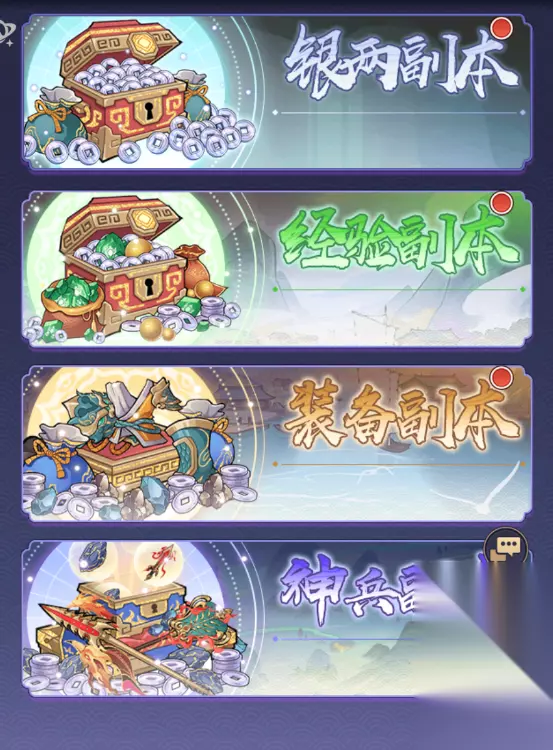 1.资源副本 资源副本分成了四个,分别是银两副本、经验副本、装备副本、神兵副本;其中产出对应的日常养成资源,每天可以免费扫荡两次和花费灵玉扫荡一次。 这个是必须完成的项目,小貔貅建议各位仙友每天上线都把扫荡次数用光,可以极大的加速神将的养成。