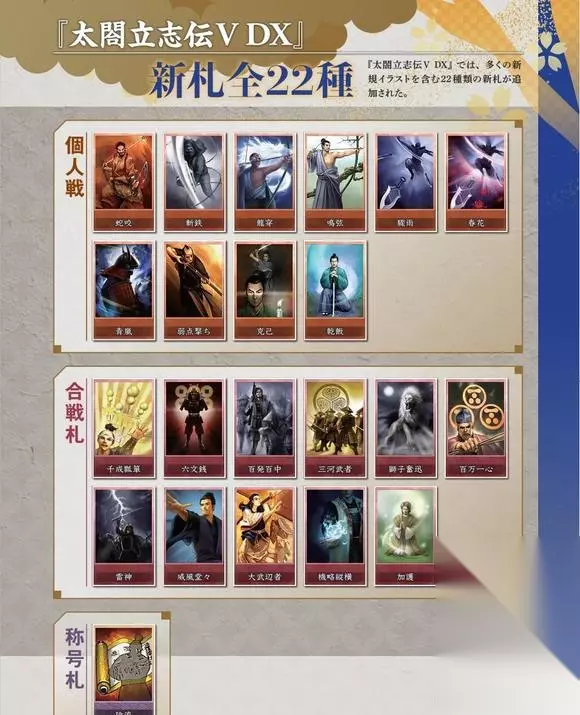 太阁立志传5DX新增独有卡片获取方法分享。在本次DX版中官方加入了许多的新增独有卡,下面带来这些卡片的获取方法,供各位玩家们参考。 DX版新增独有卡片获取方法 雷神:目前仅有NPC立花一家持有,前期剧本外交大友同盟并找立花道雪,后期找立花宗茂,都很好学。 威风凛凛:直接去小田原町找小田原剑圣学最方便,织田家和其他也可以找细川藤孝 千层瓢箪:比较麻烦,早期织田德川可以直接找猴子学,后期剧本没人会,只能托梦or真田幸存自己剧情给。 毗沙门天:前期剧本找宇佐美定满or上杉景胜,后期找直江谦续,上杉外交同盟稍微困难。 风林火山&六文钱:甲斐唯一指定二五仔真田昌幸,喝茶就能把人拐了,后期还送城池,找幸村学。 百万一心:毛利唯一指定二五仔小早川隆景,而且这哥们不管你做啥职业都能拐到…… 狮子奋迅:唯一指定攻城炸弹人,北条系(包括风魔小太郎)都会。 大武边者:跟出云阿国好感度高,拜访给。 机略纵横:可以通过军神称号剧情给。 百发百中:杂贺孙市和他老爹,雨天火枪大炮五连击,打杂贺和本愿寺头都被他们打穿了…… 机略纵横:可以通过军神称号剧情给。 以上技能卡都可以通过义经托梦拿到。