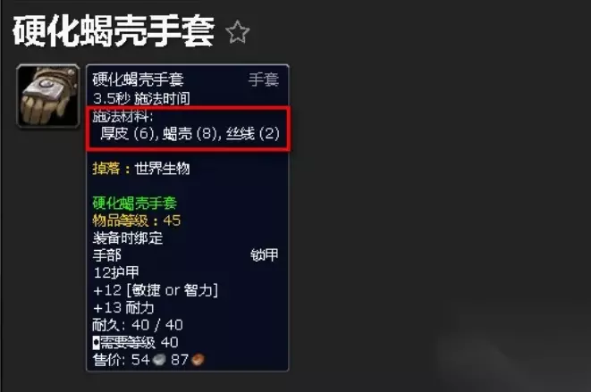 2、找到NPC索卡夫·龙眼接取龙鳞制皮任务,做2套硬化蝎壳胸甲、2套硬化蝎壳手套和10片龙鳞。
