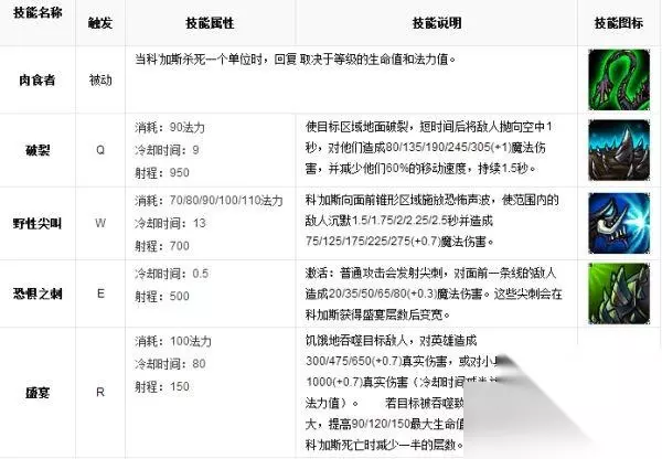 英雄属性 生命值 440 (+80/每级) 魔法值 205 (+40/每级) 护甲 19 (+3.5/每级) 射程 125 攻击速度 0.58 移动速度 345 攻击力 54.1 (+4.2/每级) 生命回复 1.5 (+0.17/每级) 法力回复 1.29 (+0.09/每级) 魔法抗性 30 (+1.25/每级) 使用技巧 当你使用虚空恐惧 尽量调整普攻的角度,好让虚空尖刺能够同时击杀敌方小兵并伤害敌方英雄。 如果你难以吃掉英雄的话,那就多吃小兵让自己变大。 将破裂与肉食者联合使用可以很好地增加生命和法力。 敌人使用虚空恐惧 购买一些增加生命值的物品能够降低被科加斯快速杀死的机率。 集中精力阻止科加斯达到其最大体积,或者在你杀死他之后又恢复到其最大体积。 破裂技能释放前,附近地面会有烟云预兆。你要对此多加注意,阻止科加斯的连击。