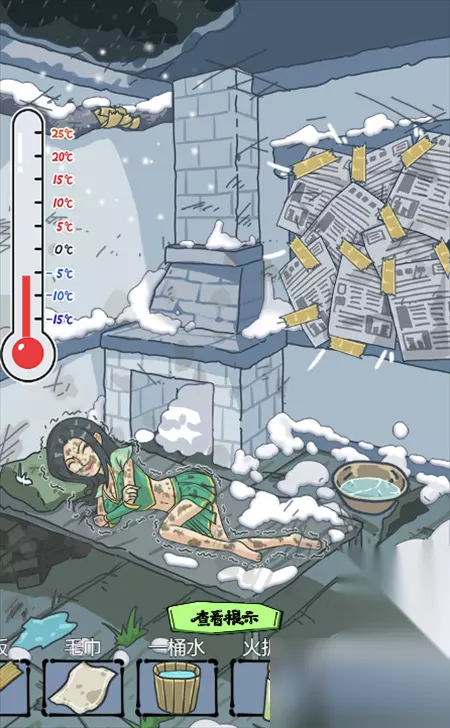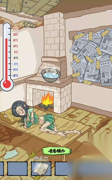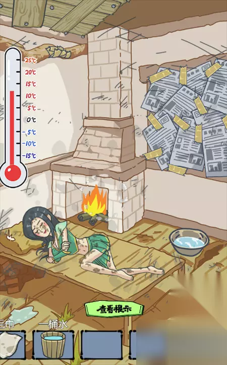 3、使用一桶水冲刷墙壁,将脸盆移动到壁炉上面加热,然后将毛巾拖到脸盆里面获得热毛巾;