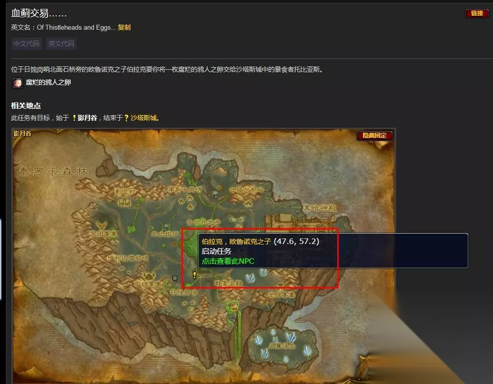 血蓟交易是怀旧服影月谷诅咒密码系列任务其中的一步,任务要求玩家们收集一个腐烂的鸦人之卵,然后交给沙塔斯的暴食者托比亚斯,不少人不知道这个腐烂的鸦人之卵应该要去哪…