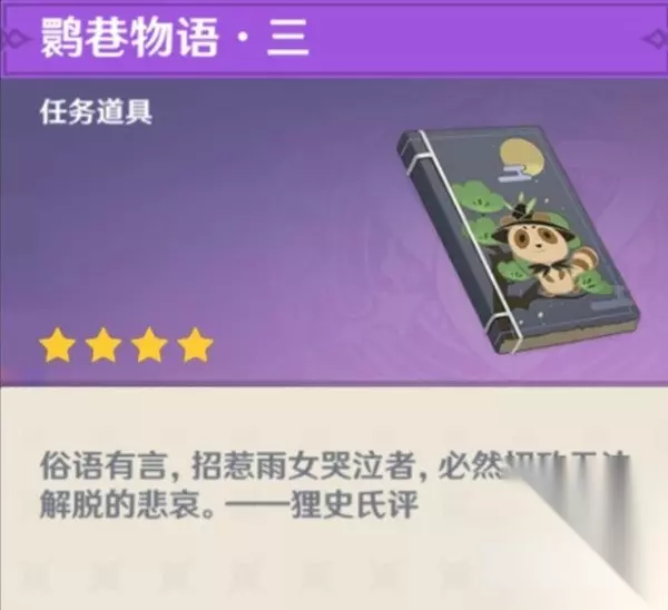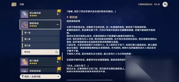 十处残页集齐后,在背包里合成《鹮巷物语·三》,可以书籍查询鹮巷物语第四卷