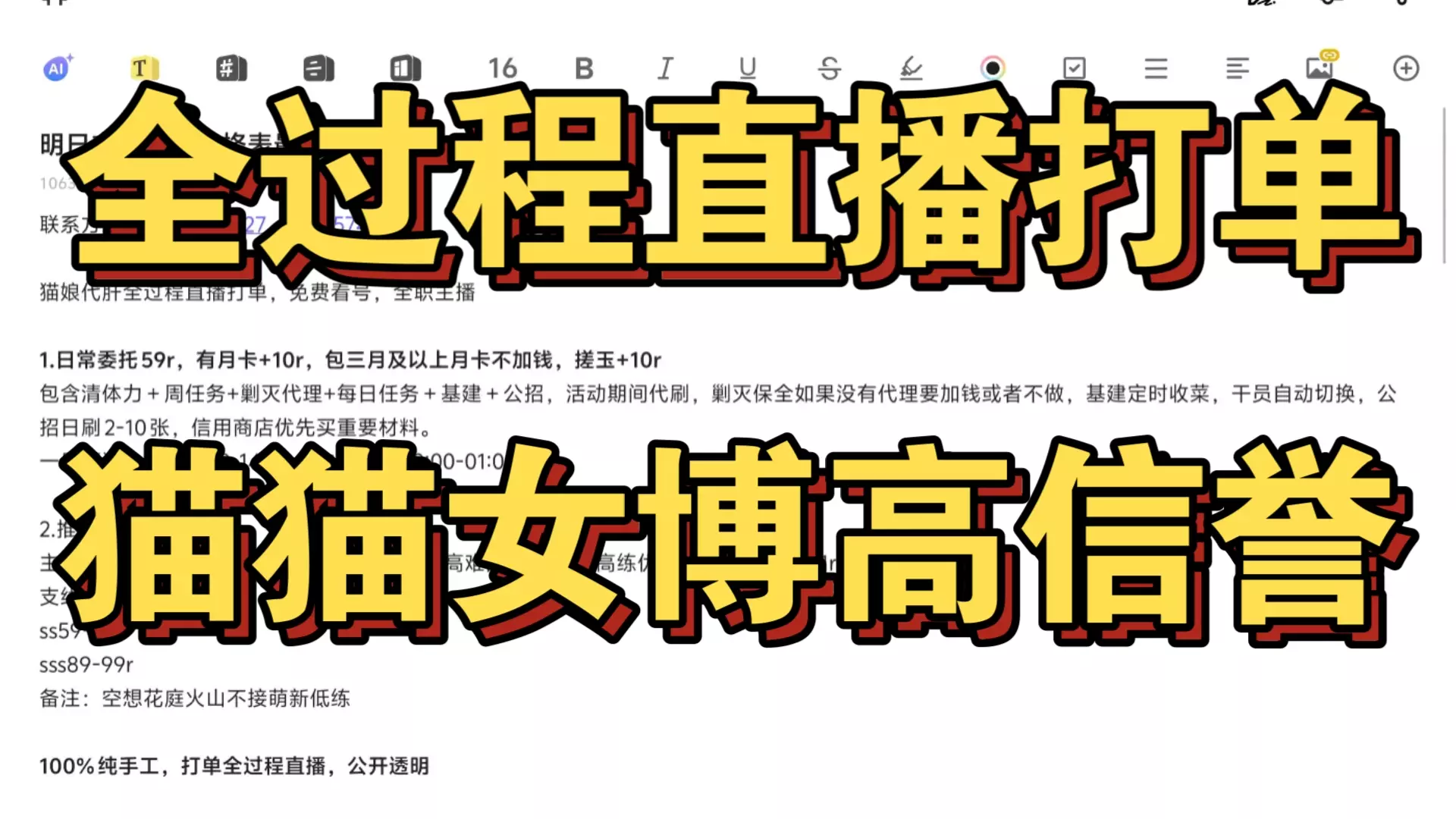 主接业务 原神 星穹铁道 鸣潮 绝区零 营业时间 全天(没回消息就是在睡觉) 个人信息 纯手工代肝,信誉绝对可靠! 先付后打上号完单后删号记录。全程直播无需担心…