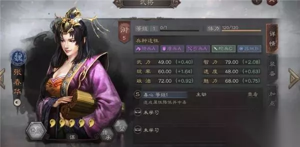 7、张春华: 这是一名输出兼辅助武将,技能可以按照百分比降低对方的智力,非常克制一些高智力的武将,适合搭配谋略输出型队伍使用。