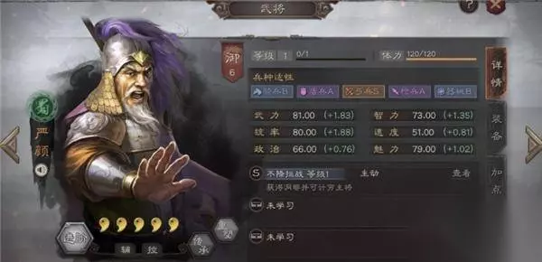 3、严颜: 严颜是一名辅助武将,蜀弓的一块拼图,不过属性不佳。自带技能几率偏低而且需要准备,但是辅助技能非常强大,在释放的时候可以为全队施加洞察状态。