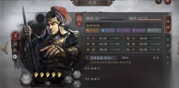 4、周泰: 这名武将相信大家都比较属性了,也是一名辅助肉盾角色,该角色最大的特点就是能为主将增加抵挡伤害,而且搭配孙权的时候还可以造成额外的效果。