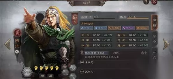 5、陆抗: 陆逊的儿子,都督队的插足者,同样是一名能为主将分担伤害的武将,不过区别在于陆抗还可以在第四回合的时候提高主将30%的奇谋几率。就是自身统率成长略低,不过还是一个非常优秀的辅助。