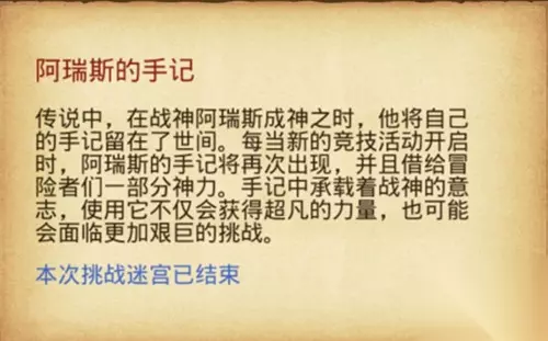 在游戏中,阿瑞斯的手记,是一件buff物品 第二季的挑战迷宫开启玩家进入迷宫时背包里多了一件物品 阿瑞斯的手记,其实这个装备每一季挑战迷宫开启都会出现,帮助大家更轻松的在迷宫里冒险,而且每一季效果都不一样