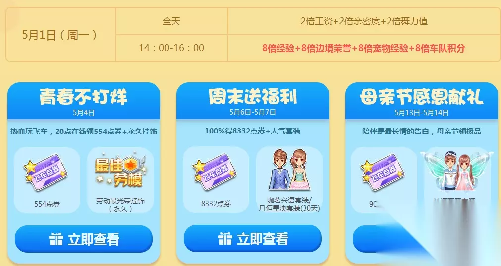03.在线送海量点券 5月1日(周一)14:00-16:00累计在线2小时,即可获得5888点券