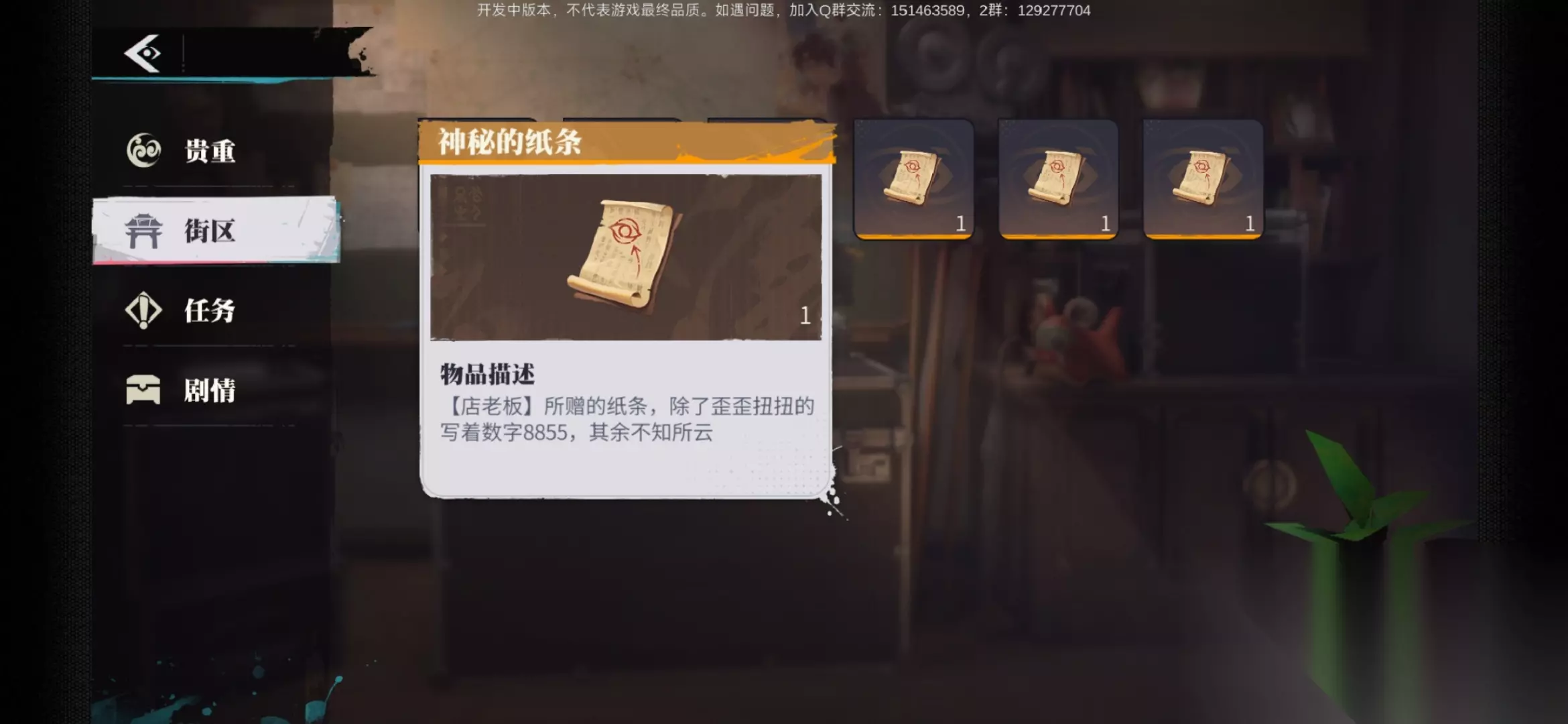 接下来我们回到老板处,老板就会给我们带有密码的纸条密码为8855,开启阴阳眼就能就能打开宝箱了
