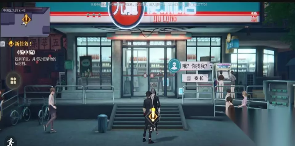 聊天后我们会传送到九龙便利店门口处,之后子鼠一直都会在这里后续还可以来这里找子鼠对话
