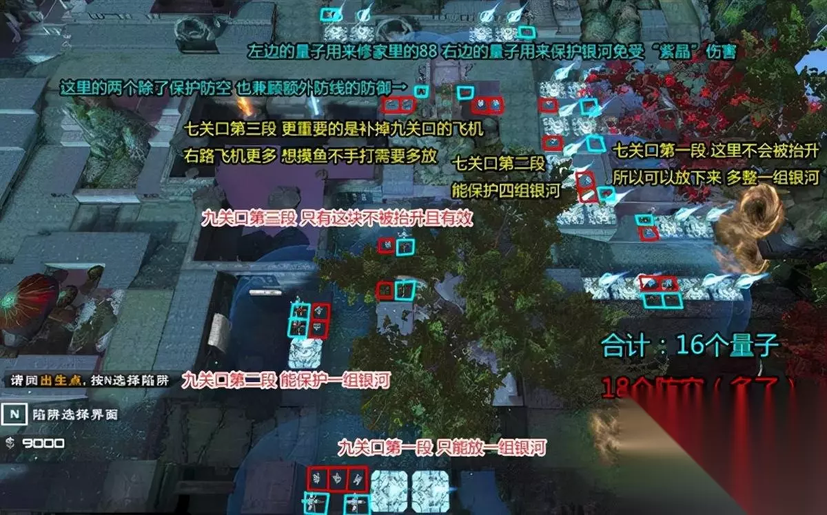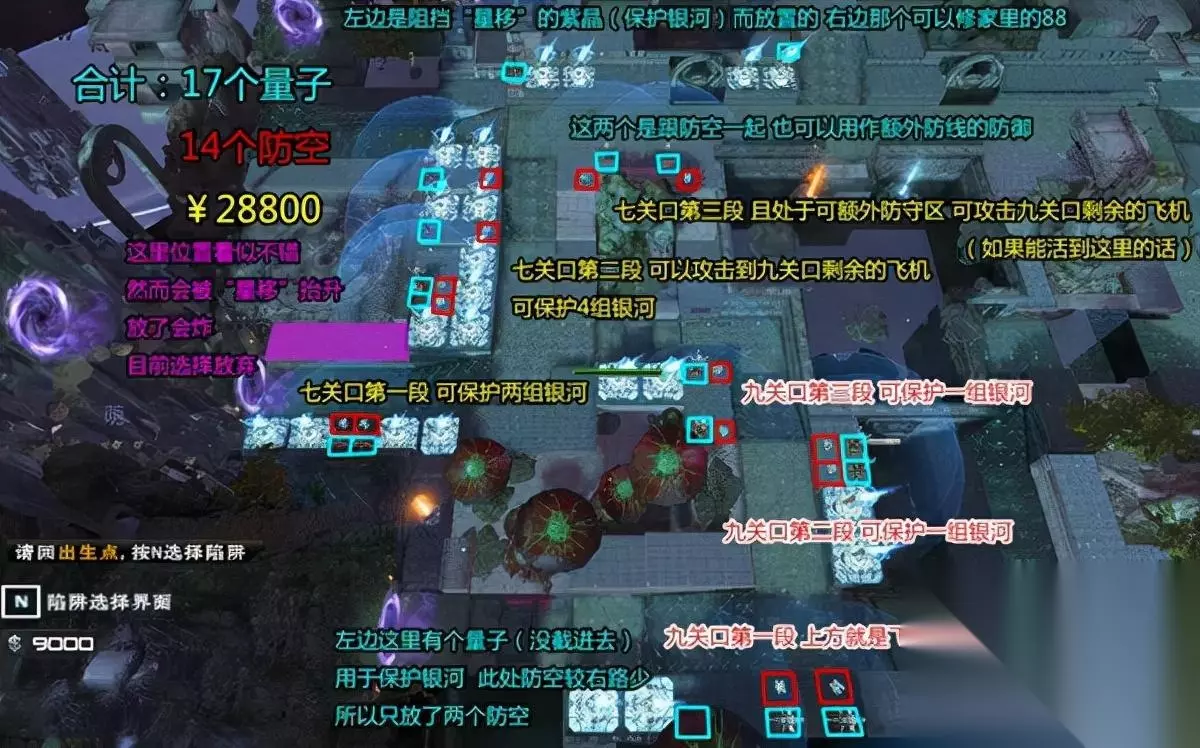 以上是小地图左路防空量子的大致布局,基本上遵循最大程度不干扰双银河和裂空战矛(新98分支)放置这个原则的同时,也避开了“星移”抬升干扰的区域。