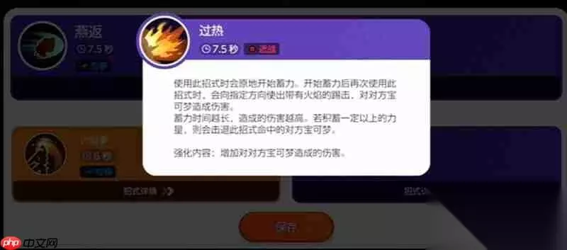 过热 这是一个需要蓄力的大范围高伤害技能,但蓄力期间较容易被打断。建议搭配闪现使用,既能调整方向又能迅速贴近敌人。命中后还能将目标击退,是火焰鸡打出爆发伤害的重要手段。