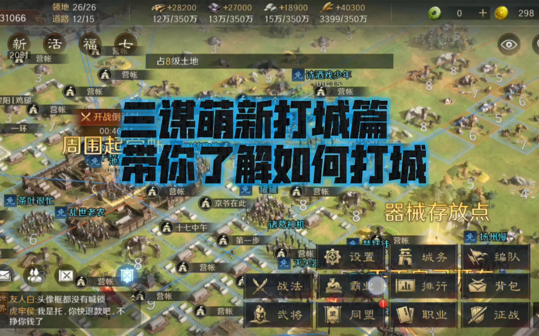 现在攻略都是教人如何开荒以及配将的,关于这点反而基本上没有,都是从其他SLG来的或者是第一次玩,三谋区别与其他游戏,打城不需要建造营帐,只需要同盟建造攻城大营然…