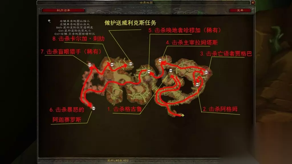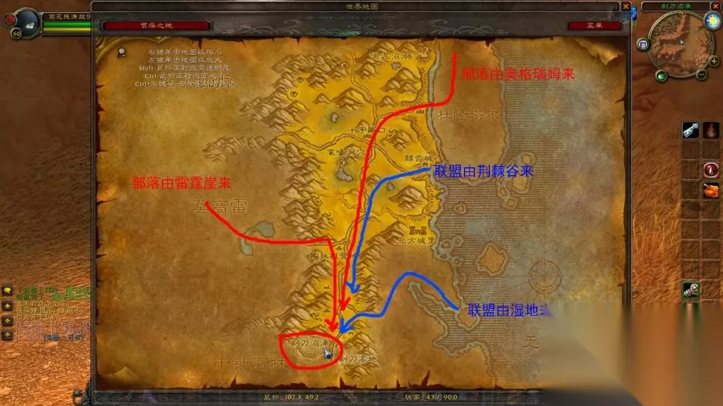 二、打本线路 1.剃刀沼泽副本集合石位于贫瘠之地的下方左侧,坐标43.7,90。向左一直走即是副本入口。