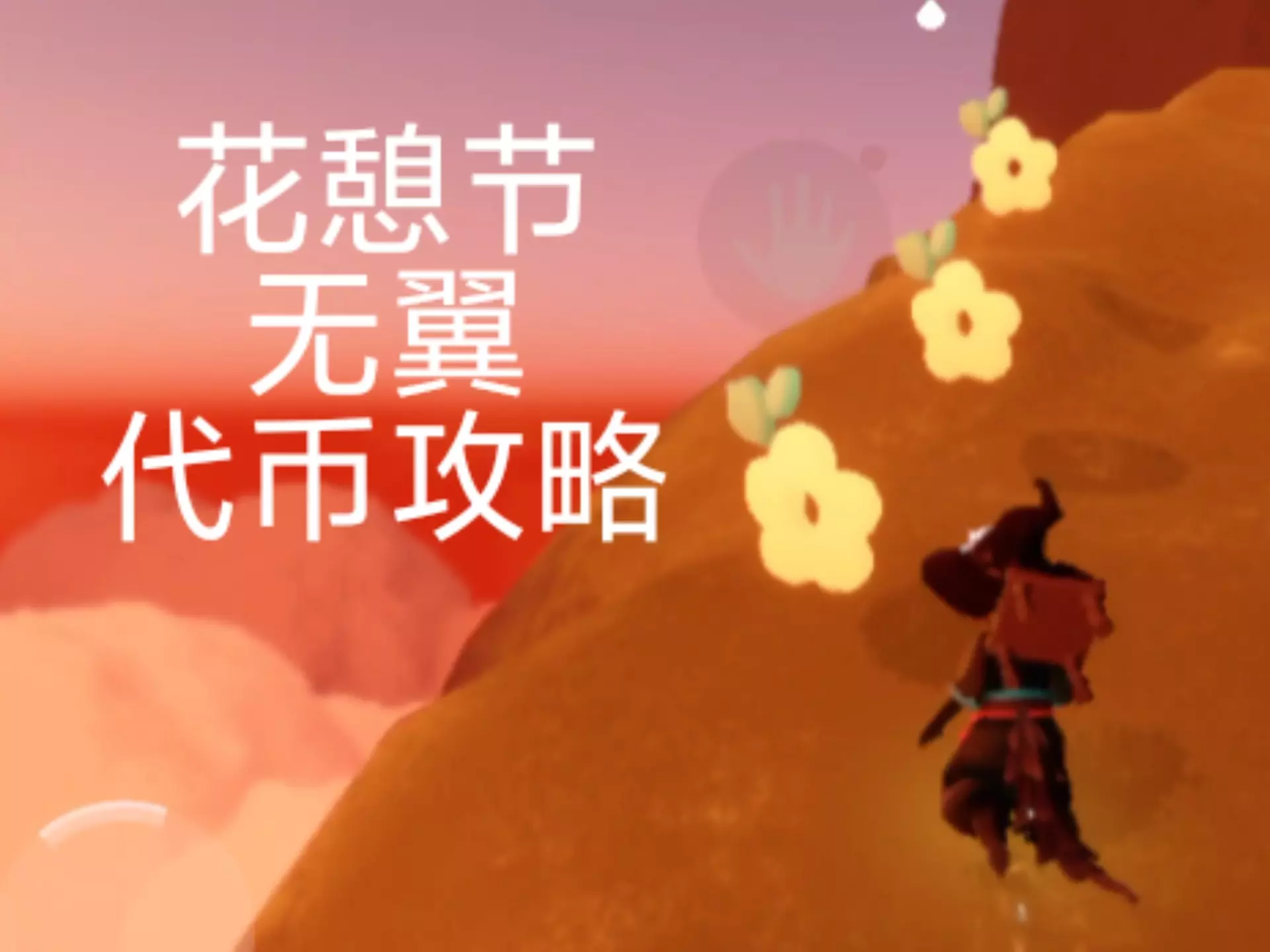 这是冒险游戏《光遇》花憩节的相关内容,展示无翼角色单人获取塔尖代币的操作,还提及要先讲解难度较高的塔尖山顶代币获取方法,帮助玩家完成代币收集。