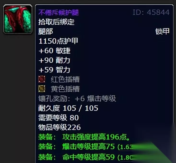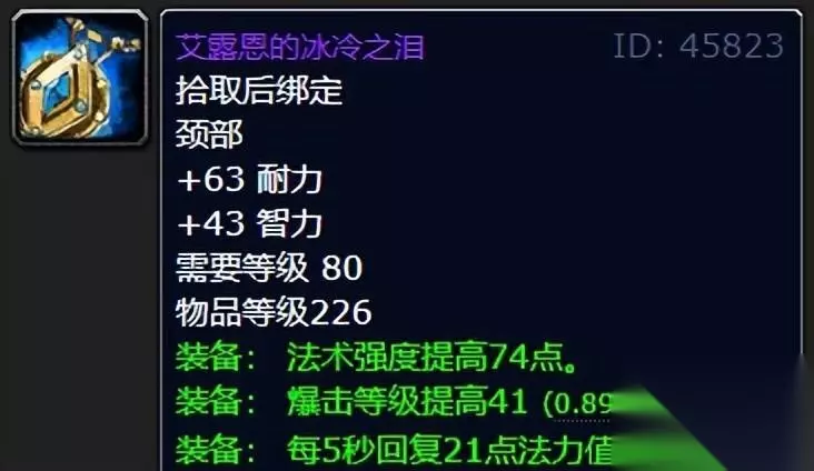 猎人可能因为精确瞄准手套不带插槽而有所遗憾,那么看到这款不倦斥候护腿的话是不是瞬间喜上眉头表示“还是喵叔最疼我们猎人了!” 当然那是肯定的,谁叫喵叔我当年巫妖王之怒版本也是非常的热爱猎人这个职业的,每天蹲守灵魂兽,无聊了还能去钓钓鱼,可谓是别有一番风味的美好回忆了。 这东西真的不用多加阐述,肝就对了! 十:艾露恩的冰冷之泪