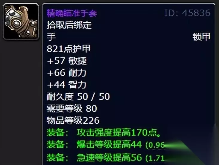 一番介绍下来,思来想去不能忘记了猎人大军啊,细细查找一番,这款高额急速以及爆击等级的手套对于排骨猎人玩家喵叔觉得非常的适合,毕竟属性也是给的超级给力,攻击强度170点打个输出及格丝毫不成问题,兄弟们准备好肝了吗? 九:不倦斥候护腿