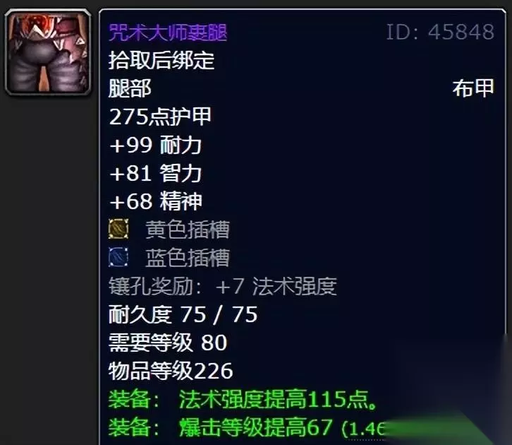双插槽高敏捷的迷影护腿,喵叔我想应该能让黄总盗贼瞬间化身小迷弟了吧!而且高额急速以及命中等级的提高都是你配装的绝佳搭档,虽然说黄总盗贼表示我可不是排骨人,但是拿了他过渡绝对不错,至于给力程度嘛,喵叔我想给我家天花板戳上几个大洞是应该没有任何问题的。 二:咒术大师裹腿