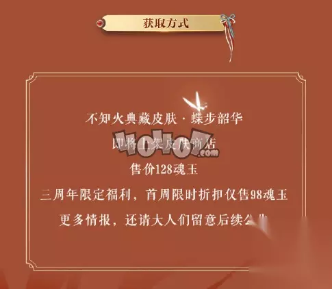 蝶步韶华是阴阳师里不知火的新皮肤,对应的是不知火的周年庆,所以是很有收藏意义的。这件衣服需要花钱购买,下面来看看价格吧~对于真爱党们,还是非常值得入手的。 阴阳师不知火典藏皮肤蝶步韶华怎么获得? 皮肤商店上新! 不知火典藏皮肤·蝶步韶华上架皮肤商店,欢迎各位阴阳师大人前往购买。 ☆不知火典藏皮肤预告☆ 轻歌曼舞,蝶步韶华,不知火全新典藏皮肤即将上架,首周更有周年庆限定福利折扣降临,不知火典藏皮肤更多情报,请期待后面报道!✧٩(ˊωˋ*)و✧