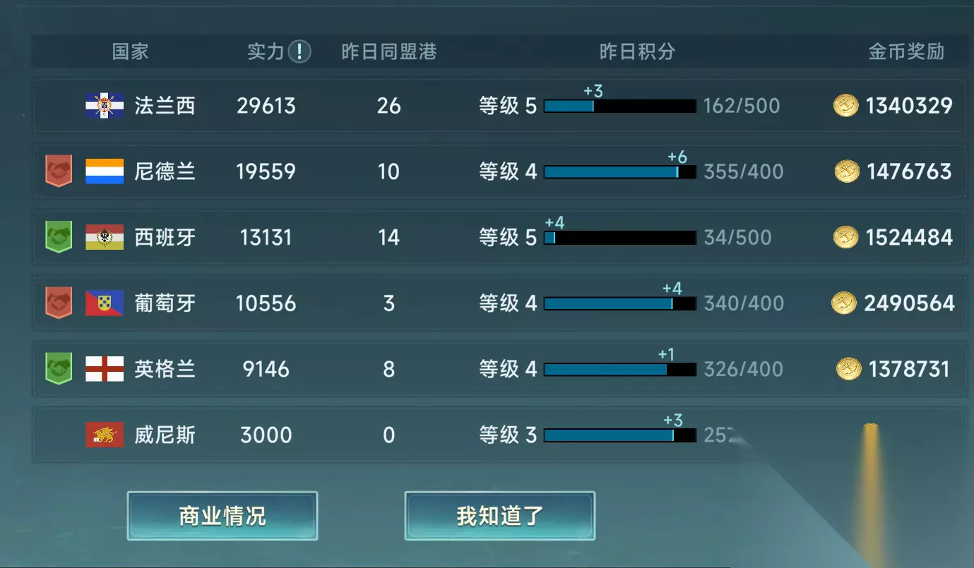 这个就属于可买可不买了,如果有需求的还是可以购买一下,没有的话,不买也没有太大损失。 最后就是国家形势了,点击这个我知道了,每天可以获得500金币,也是积少成多,大家每天可以花费几秒钟点击一下即可。