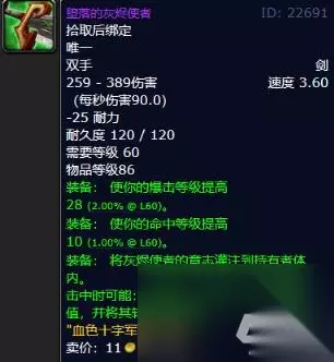 堕落的灰烬使者属性介绍: 堕落的灰烬使者 259 - 389伤害 速度 3.60 (每秒伤害90.0) -25 耐力 装备: 使你的爆击等级提高28。 装备: 使你的命中等级提高10。 装备: 将灰烬使者的意志灌注到持有者体内。 击中时可能: 吸取敌人185到215点生命值,并将其转移给施法者。