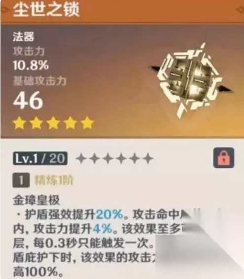 尘世之锁武器介绍: 尘世之锁为五星法器,可以增加搭配角色基础攻击力和百分比攻击力 满级的尘世之锁可以提升角色608点基础攻击力和49.6%的百分比攻击力。